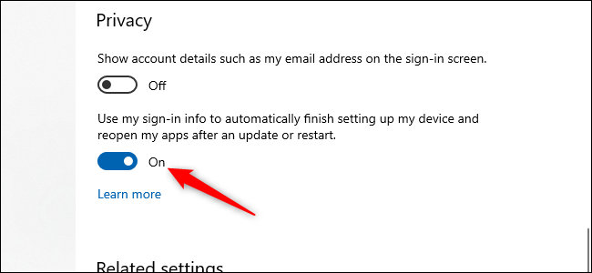 Open the Settings app (click “Start” and then select the settings cog) in the lower left of the Start Menu. Inside the Settings app, select Accounts > Sign-In Options. Then under Privacy turn off the slider labeled “Use My Sign-In Info To Automatically Finish Setting Up My Device And Reopen My Apps After An Update Or Restart.”